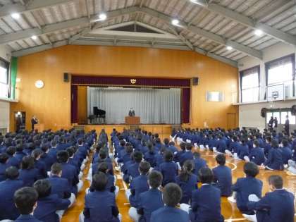 最後に,校長先生は「いつも笑顔があふれる楽しい学校」を作りたいと思っています。修学院中学校の皆さんの,笑顔をいっぱいにするためにも,元気いっぱいにあいさつをして,友達を大切にして,授業も部活動も目標を持って,やる気いっぱいで,がんばってほしいと思います。みんなですばらしい学校にしていきましょう。