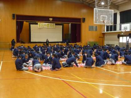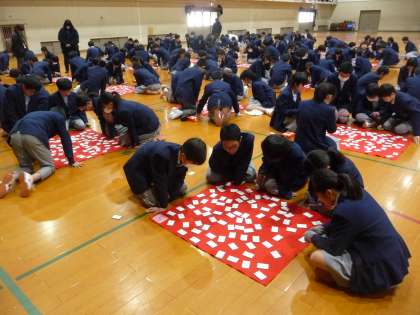 本日,6限に1年生の百人一首大会が体育館で行われました。目的は,日本の古典に慣れ親しみ,他クラスとの交流を深め,学年の親睦を図るです。少し寒い体育館でしたが,生徒のみなさんの熱気のせいか,あまり寒さを感じない中で熱戦が繰り広げられました。2年生同様,百人一首を通して,和歌の響きを感じとり,他のクラスの友人との交流も深まったと思います。