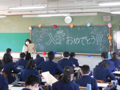 新入生が退場の後,体育館内において保護者の皆様へ1年学年主任の挨拶・生徒指導部長からのお話・PTA会長の挨拶を行いました。その間,新入生は担任から配布物の確認や短時間ではありますが,担任の自己紹介など学級開きをおこない,下校となりました。明日からは休校まで2日間だけですが,元気に全校生徒が登校する事が待ち遠しいです。