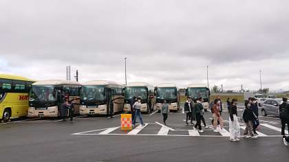 予定通りの時間にトイレ休憩の梓川SAに到着しました。各号車から降車してきた様子を見ると、眠そうな表情を浮かべる生徒が多いです。約15分休憩後、次のトイレ休憩の恵那峡SAに向けて9時20分に出発しました。