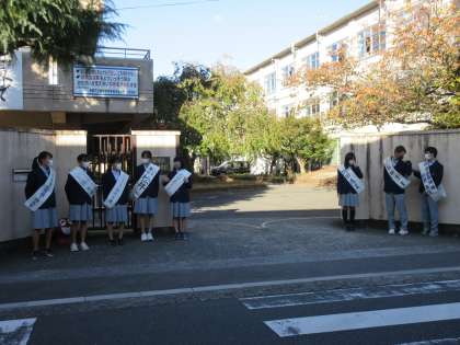 今日から11月4日におこなわれる生徒会本部役員選挙に向けての選挙運動がスタートしました。登校する生徒の皆さんに,正門(東門)と西門に分かれて,「○○に立候補をしている○○です。よろしくお願いします!」と立候補した役職名と自分の名前を大きな声でアピールしていました。昼食時には,放送による選挙活動もおこなわれます。11月4日の投票日まで,それぞれの熱い思いを全校生徒に訴えて下さい。