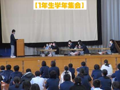 本日,2限に3年生,3限に2年生,4限に1年生のそれぞれ学年集会がおこなわれました。各学年,各学級の2学期の反省や課題,良かったところなどを各クラスの代表が発表しました。また,SCW(修学院ウィーク)の取り組みの報告や学年レクの表彰,寸劇にした2学期の振り返りなど,生徒の司会進行で学年毎に工夫された学年集会でした。最後に学年教員から2学期の振り返りや冬季休業中の生活,3学期に向けての話をし終了しました。