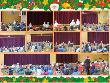 本日,午後1時40分より約50分ですが,吹奏楽部の「クリスマスコンサート」を体育館で感染予防対策をとりながら開催しました。まず2年生がアンサンブルによる打楽器三重奏・木管六重奏・金管八重奏の順に演奏し,そして,1年生だけの演奏を披露しました。その後,1・2年生の演奏で最後を締めくくりました。アンコール曲は,修中吹奏楽部自慢の「風になりたい」を演奏しました。どの演奏も日頃の練習の成果を発揮し,今日のクリスマスの日に最高の素晴らしいプレゼントをしてくれました。これからも本校吹奏楽部のご支援,よろしくお願いします。