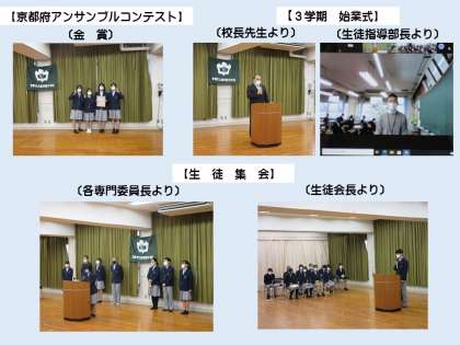 始業式前に昨日行われた第54回京都府アンサンブルコンテストにおいて,本校吹奏楽部代表の4人がサクソフォーン4重奏において見事『金賞』を受賞しましたので,その表彰をオンライン配信でおこないました。その後,校長先生と生徒指導部長から3学期に向けての話と感染防止対策の徹底などの話をして3学期始業式は終了しました。続いて,生徒会執行部による生徒集会がおこなわれ,命の道徳の今後に向けての取組と各専門委員長や生徒会長からの話をしました。2限目以降は,休み明けテスト(1・2年生)や学活・学年集会等で3学期に向けて,それぞれの学級・学年での学校生活の過ごし方を確認しました。