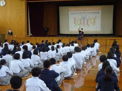 6月6日(月)6限に2年生はKDDIの方をお迎えし,スマホ・ケータイ安全教室を実施しました。3つのトラブル事例(人間関係,依存,出会い・犯罪)をもとに,人の嫌がること,迷惑になることはしない,書き込まないこと。利用時間を決め,お金のかかるアプリやサイトの利用は保護者に相談して決めること。知らない人とはやり取りしない,会わないこと。不適切な投稿をしない,個人情報は書き込まないこと,などを学びました。