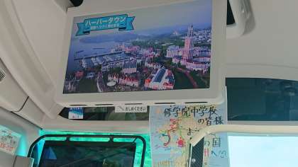 予定より10分早く昼食場所から長崎市内をあとに、ハウステンボスへ出発しました。バス内ではハウステンボスのガイドビデオを視聴しています。でもこれからの研修に向けて睡眠している生徒も中にはいます。