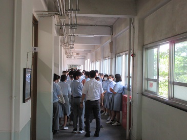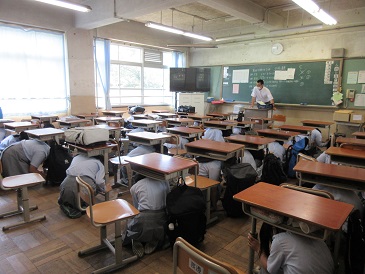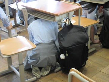 本日,4限終了後に震発生を想定した避難訓練を実施しました。事前指導として,災害時の心構えや避難訓練の意義,避難経路の確認後,地震の発生と避難指示の校内放送をおこないました。身を守るために机の下に隠れ,担任の先生の誘導で,今回は熱中症予防対策として,グラウンドには集合しないで,全学年,廊下に整列するのみとしました。地震が各地で頻繁に発生しています。今日の訓練を機に,災害時における安全な行動と心構えについて再確認しましょう。