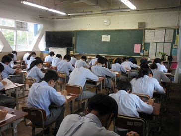本日、2年生は1限から5限まで「学習確認プログラム」Pre stage1の実施です。事前に配布された「予習シート」で今回の範囲を学習し、今日をむかえています。今回の学習状況の結果は8月下旬に返却されます。学習が身についていない単元については、「復習シート」で補っていきましょう。「学習確認プログラム」を有効に活用し、学習の振り返りに大いに活用してください。