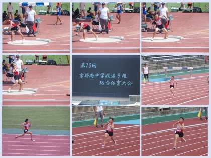 本日,第75回京都府中学校総合体育大会の陸上競技の部がたけびしスタジアム京都陸上競技場で開催され,本校からは3年生女子砲丸投げ・3年女子200M走・3年男子100走の3種目に1名ずつが出場しました。砲丸投げは決勝には進むことができませんでしたが,精一杯頑張りました。女子200M走は決勝まで進みましたが,惜しくも4位となり,近畿大会出場まで後一歩でした。男子100走は準決勝まで進みましたが,決勝まで進むことができませんでした。非常に気温が上昇し,大変暑い中で体調管理が難しかったと思いますが,どの選手も精一杯,持てる力を試合で発揮したと思います。お疲れ様でした。