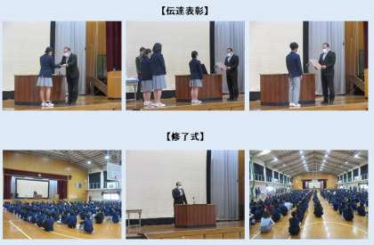 本日、令和4年度「修了式」を体育館に1・2年生の全生徒が集合し、全校集会隊形で行いました。距離を取りながら、マスク着用や換気など、基本的感染対策を講じながら実施しました。修了式の前には、「京都市中学校生徒書き初め展」・「近畿中学生バレーボール選抜優勝大会京都府予選会」・「令和4年度ラグビーフットボール秋季新人大会」の伝達表彰をおこないました。続いて、修了式では、学校長から卒業式での答辞の中の在校生へのメッセージを伝えたり、4月から学年が一つ上がることでの自覚を持つことなどを話されました。その後、生徒指導部長より、3年生送る会の御礼や取組の成果をねぎらいました。修了式後には、生徒会本部による生徒集会があこなわれ、一年間の振り返りや4月からのスタートに向けて、各専門委員長や生徒会長から話をして終了しました。
