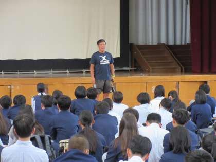 本日、6限目に体育館にて、3年生「修学旅行 結団式」をおこないました。学校長から明日からの修学旅行に向けての話の後、横断幕にした修学旅行のスローガンが3年生に贈呈されました。その後、修学旅行実行委員長のあいさつをはじめ、実行委員会からの連絡がありました。最後に学年主任からの明日の諸注意などで終了しました。いよいよ明日から九州・長崎への修学旅行が始まります。最高の思い出になりますように、ルールやマナーを守り、修学旅行スローガンである『知る・楽しむ・繋がり』を意識しながら3日間を有意義に過ごしましょう。