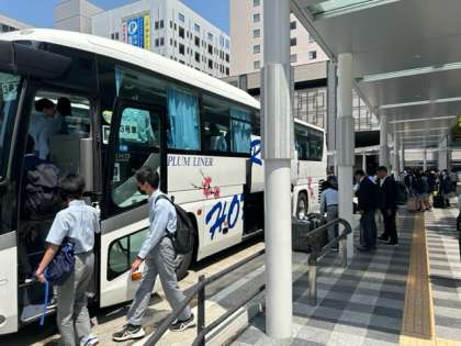 晴天の中、定刻通りに博多駅に到着し、バスへ移動しました。これから昼食会場のホテル『龍登園』に向かいます。現在、11時10分です。約1時間で到着します。早朝集合のため、「お腹が減った」の声があちこちで聞こえています。