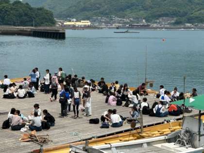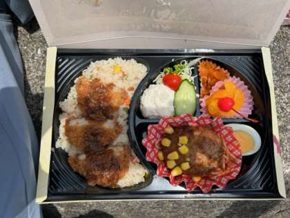 ペーロン競走が終了し、お腹も減り今から昼食です。天気も良く、青空の下で食べたり、室内で食べたりと、楽しく話をしながら昼食をとっています。そして、昼食のお弁当の写真です。美味しそう〜!