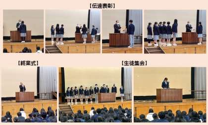 本日、「2学期終業式」をおこないました。終業式前には、2学期後半に各教科や部活動などで、多くの生徒が素晴らしい結果と成績を残してくれましたので、全校生徒の前で伝達表彰をおこないました。その後、終業式では校長先生から2学期のまとめの話と体調管理に気をつけながら冬休みを過ごしてほしいとの話がありました。続いて生徒会執行部よる生徒集会がおこなわれました。最後に、生徒指導部長の先生よりSNS等についての注意などをおこない終了しました。2限目からは、大掃除と学活で2学期を締めくくりました。冬休みを有意義に過ごし、1月5日の3学期始業式には元気に登校しましょう。