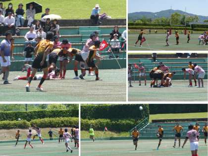 5月11日(土)、春季大会ラグビーの部の決勝トーナメント準々決勝が宝ヶ池球技場にておこなわれ、四条中学校と西陵中学校との合同チームと対戦しました。晴天の中、勝利を目指してチーム一つとなって試合にのぞみました。相手のスピードやステップワーク、フォワードの突進などにもあきらめず、我慢しながら精一杯、自分たちの力を発揮し、トライもしましたが、残念ながら力及ばず敗退しました。夏季大会に向けて、この悔しさをバネに今後の練習を頑張る決意を部員全員で確認しました。暑い中、多くの保護者の皆様、在校生や卒業生の皆さん、応援ありがとうございました。
