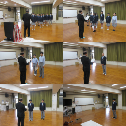 本日、定期テスト終了後の4限にオンラインによる春季大会の伝達表彰と6月に開催される陸上部の夏季大会に向けての決意表明をおこないました。伝達表彰では女子バレーボール部の優勝、剣道部女子の団体準優勝と個人第3位、ワンダーフォーゲル部の団体第2位と個人第5位、柔道男子個人第2位、陸上部男子800m優勝、男子走り幅跳び第3位の表彰をおこないました。賞状はなくとも、春季大会にのぞんだ生徒の皆さんの頑張りは素晴らしい姿でした。夏季大会に向けて、さらに自分の力を発揮できるように期待しています。水泳部の皆さんは6月に実施される春季大会に向けて頑張ってください。