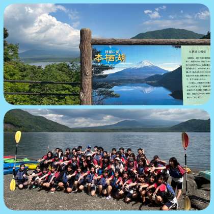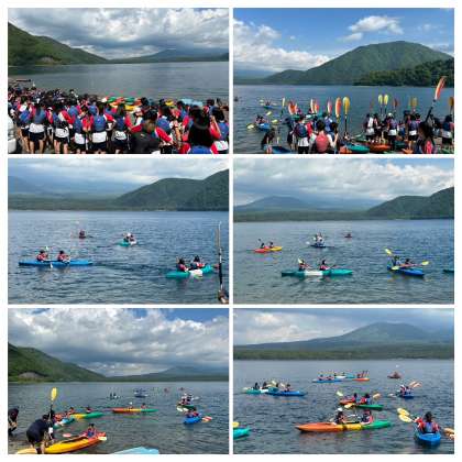 富士山の頂上は隠れていましたが、素晴らしい晴天の中、清々しい風が吹く中、カヌー体験をしました。初めは上手く漕げませんでしたが、時間が過ぎるにつれて、どのペアも上手に漕げるようになり、笑顔があふれた楽しい体験でした。