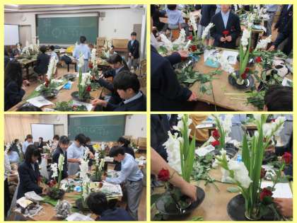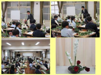 本日、1年生は「未生流笹岡」家元の笹岡隆甫様を講師にお招きして華道体験をおこないました。生け花では時間経過を大切にすることや花との対話についてなど、様々な教えをいただきました。それぞれの感性による仕上がりを見て、華道の奥深さを少し味わうことができ、ほとんどの生徒が初めての経験で難しさもありましたが、「生け花」に触れ、伝統文化の良さが感じられた時間となりました。持ち帰った花を家で再度、今日の華道体験で教えていただいたことを思い出し、花を生けてください。そして、ご家族方にも体験した事を伝えてほしいと思います。
