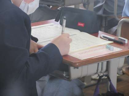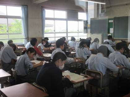 本日、本校を準会場とした「英語検定」を実施し、5級24名、4級15名、3級32名、準2級2名、2級5名の計78名が受検しました。部活動にも協力を得て、声出しや音などを控えるなど、静かな環境を整えた中で、どの生徒も学習してきたことを精一杯発揮するため、問題に集中して取り組んでいました。全員が合格することを願っています。3級以上の合格者には、一次試験に合格すると二次試験(面接試験)があります。本校の学校運営協議会のスタディ部会の方々に模擬面接をおこなっていただく予定となっていますので、合格者には後日、連絡をさせていただきます。
