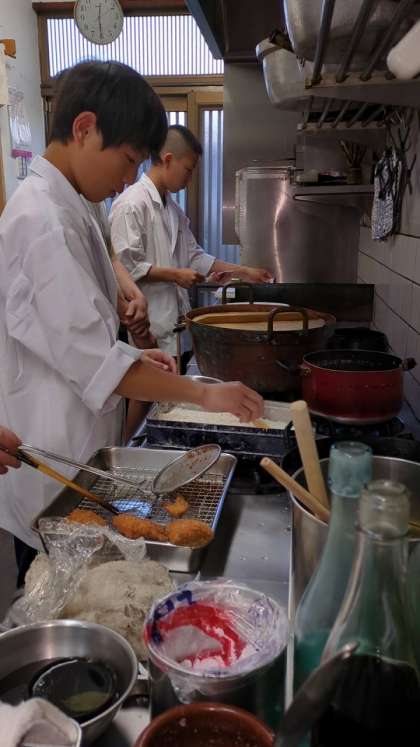 調理場での作業は1つ1つを丁寧に行う必要があります。2人とも初めて体験する作業ばかりでドキドキしている様子が背中から伝わってきます。