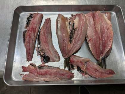 1日目は魚を3枚におろす作業をさせていただき、2日目の今日は参照の実を取る作業をさせていただき、その後は焼き場と揚げ場の体験もさせていただいています。