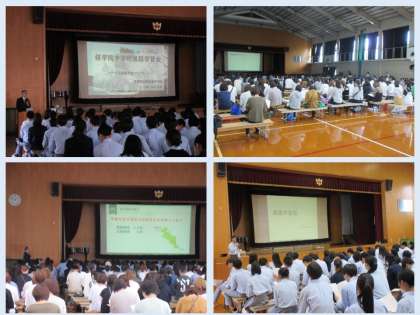 本日の5・6限に、3年生の生徒と全学年の保護者対象に「進路学習会」を合同で体育館にておこないました。公立高校代表として紫野高等学校、私立高校代表として東山高等学校からそれぞれの先生に、入試制度やその特徴をわかりやすくパワーポイントで説明していただきました。その後、本校の進路主事から昨年度の進路状況や今後の進路日程などを説明し終了しました。大変気温が高く、またお忙しい中、多くの保護者の皆様方にご参加していただき、ありがとうございました。質問などがございましたら、ご遠慮なく学年教員や進路主事にお尋ね下さい。