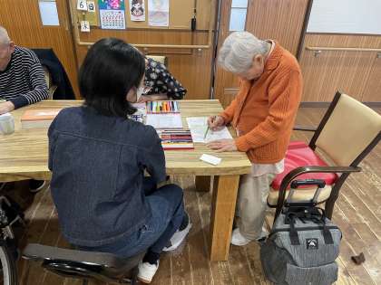 グループホームでは、利用者の方が塗り絵をされているのを話をしながらサポートしました。利用者の方から、"チャレンジ体験"は昔はなかった行事ですね、大変だと思うけれど頑張ってるね、と声を掛けていただきました。