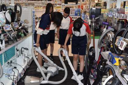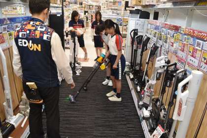 商品(掃除機)の説明を受けています。沢山の種類の掃除機が販売されています。