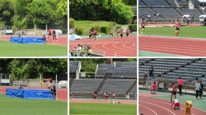 5月3日(祝)快晴のもと、陸上競技大会がたけびしスタジアムで開催されました。修学院中学からはたくさんの種目に出場しています。まず行われたのが女子100メートルハードル。続いて4×100メートルリレーの男女。そして走り高跳び。続いては800メートル男女。特に800メートルでは昨年度記録トップだった3年男子が出場。予選を軽々と突破していました。競技は午後まで続いています。