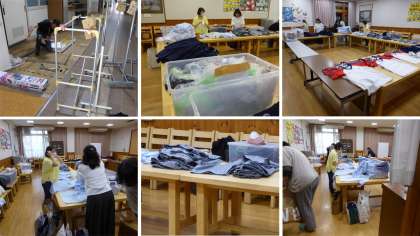 すでに保護者の皆様にはすぐーるにてお知らせがいっていると思いますが、5月31日にPTA総会が行われた後、本校の多目的室で制服のリユース販売が行われます。卒業生をはじめ、多くの皆様から学校へリユースしてくださいということで、制服や体操服を持参していただきました。今日は、PTAのボランティアの皆様が夕方から集まって、準備をしてくださっています。当日、制服が見やすいように並べたり、値札をつけたりと、大変な作業です。お忙しい中、本当にありがとうございます。