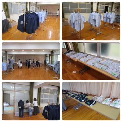 5月31日、修学院中学校PTAの方々が標準服、カッターシャツ、体操服等のリサイクルの準備をしてくださっています。