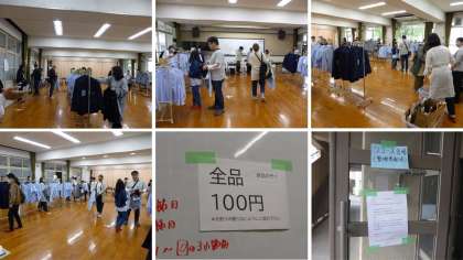 いきいき交流ルームでPTA総会が行われた後、PTAのボランティアの皆様に多目的室で制服のリユース販売会を行っていただいています。年間を通して、在校生のご家庭や卒業生のご家庭から、リユースをするために学校に制服をお預けいただきました。制服だけでなく体操服や部活動の用品なども預けてくださる方もいらっしゃいます。繰り返し使うことで「持続可能な生産消費形態を確保する」目標を達成するためにもかなり重要な取組だと思います。「つかう責任」についても思いを馳せることができるのは素敵なことですね。
