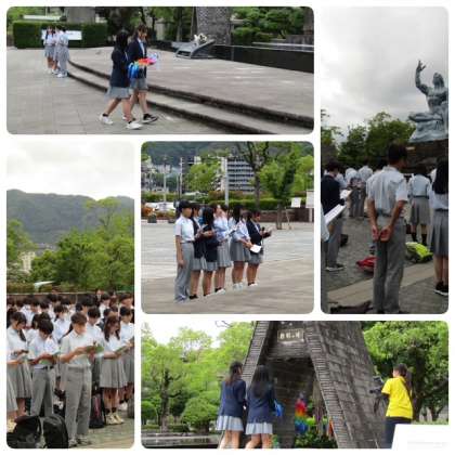 平和祈念像の前で、平和セレモニーを行いました。2025修学院中学校平和宣言と題して、三年生がオリジナルで創作してくれた宣言文です。昨日の結団式でも練習した群読とみんなで祈りを込めて一羽一羽折った千羽鶴を奉納しました。