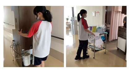 病院での体験では、看護補助の仕事に取り組んでいました。シーツの交換や荷物の運搬、備品整理など、看護の現場を支える大切な役割を体験していました。生徒たちは緊張しながらも、丁寧に仕事をしていました。