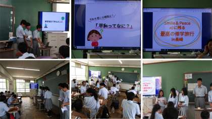9日(水)、2、3年合同の総合的な学習の時間が行われました。3年生が修学旅行で学んだことなど、事前学習も含め2年生に班で発表しました。3年生が一貫して取り組んでいたテーマは「平和」についてです。「戦争」という言葉に対しての「平和」だけでなく、日常、他者から脅かされることがない安心安全な「平和」、日々笑顔で毎日を送れる「平和」、幸せを追求できる「平和」など、自分たちが考えたことをパワーポイントを使い2年生に伝えていました。2年生からはこんな質問がありました。「長崎の原爆資料館に行かれて、一番怖いと思われたことは何ですか?」この質問に対し3年生は「原子爆弾がこの長崎に落とされたことが一番怖いと思いました。」この回答には深い意味があると思います。3年生が事前学習をし、そして現地(長崎)に行ったことで持ちえた考えだと思います。2年生も今日の3年生の発表から何かを学び、そして自分自身の総合的な学習につなげていって欲しいと思います。