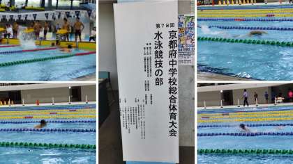 7月24日(木)水泳部の京都府大会が西京極アクアリーナで行われました。この京都府大会は京都市の市内大会を勝ち抜いた個人、チームのみが出場できます。この日、会場には京都府内の学校、スイミングスクールからの出場とさまざまなチームが集まっていました。修学院中学はチームでは400メートルリレー、個人では個人メドレー、自由形、平泳ぎ、背泳ぎとたくさんの選手が京都府大会に出場することが出来ました。予選を突破したチーム、個人は午後から決勝レースに臨みます。そして決勝5位以内が近畿大会に進出できます。保護者の皆様、暑い中、熱い声援を送っていただきありがとうございました。