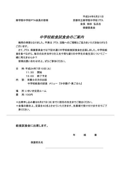 7月10日(火)11:30よりPTA主催の給食試食会が行われます。当日は栄養士さんの講演もあります。