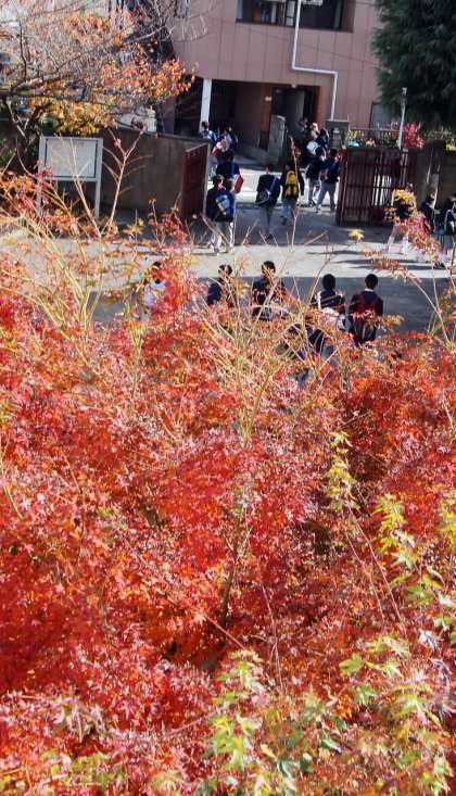 中庭のもみじは、色づいた木と、まだ、緑の残った木があります。