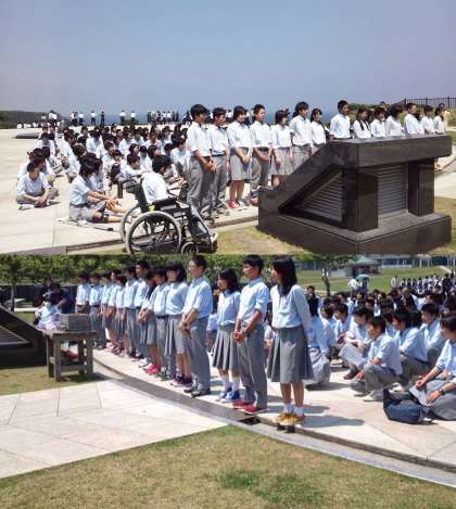 平和のセレモニーは、実行委員の生徒たちの平和の誓いを発表したのち、色紙と千羽鶴の奉納のあと、全員で黙祷を捧げました。