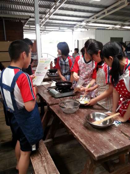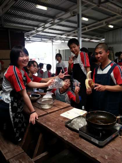 7組はサーターアンダギー作りです。仲良く作ってます。美味しいものができると良いですね。作ったものはお土産にもって帰ります。