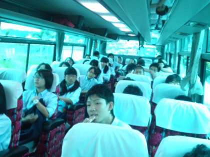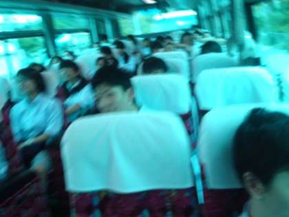 現在、2号車内では、7組&5組半分の生徒たちが、バスガイドさんのリードによるバスレク中です。
