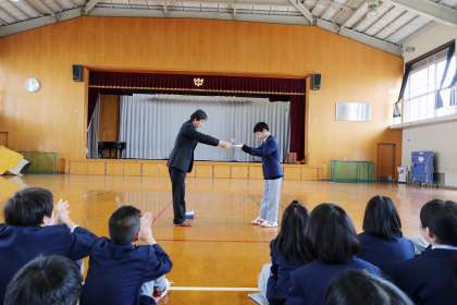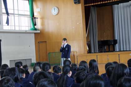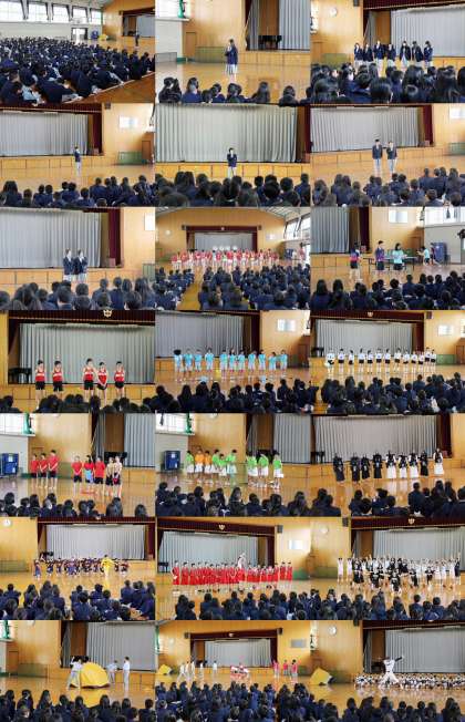 1年生が入る部活動を決めるために行うのですが、修学院中学校では三学年ともが集まり、全校生徒の前で「発表」を行います。