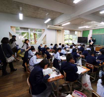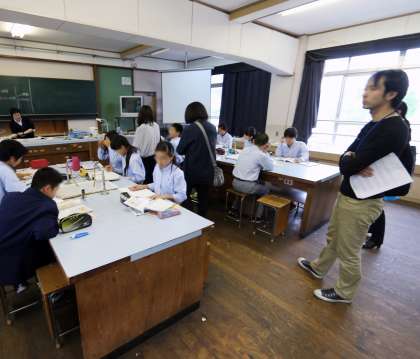 6限に小中連携の一環として、1年生の様子を小学校6年の旧担任の先生に見に来ていただきました。転勤された先生も来ていただいており、授業後生徒たちは懐かしそうに話をしていました。