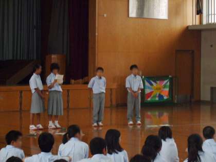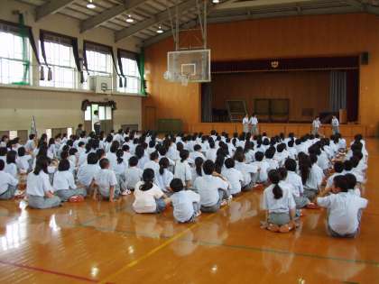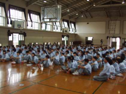 1年生は、6限に各クラスの「学級目標」の発表と、クラス自慢の発表会が体育館でありました。