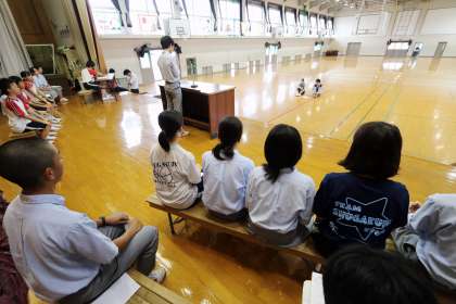 放課後、発表者が、誰もいない体育館でリハーサルをしていました。