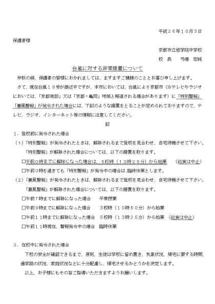 10月3日(金) 「台風に対する非常措置について」プリント配布