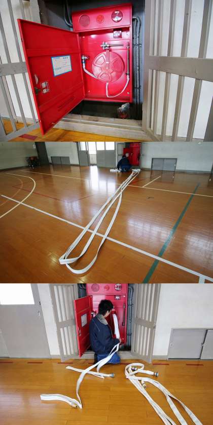 体育館や校舎の各階に「消火栓」と書かれた「赤い箱」があります。