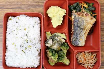 今日の給食には、七草の一つである「すずしろ」(大根)の葉を炊き込んだ「菜めし」がついていました。