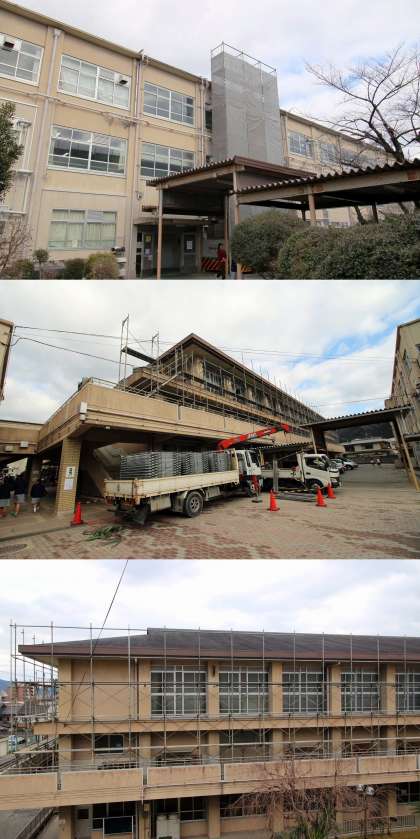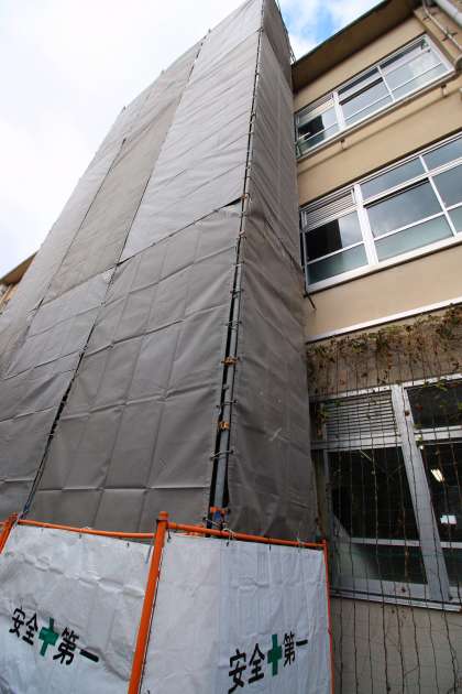 先週お知らせしたように、北校舎屋上防水工事と体育館屋根の全面改修工事が1月10日(土)より始まっています。