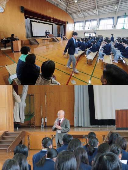 3限には、本校の第1回卒業生で同窓会長がお祝いと同窓会の説明に来ていただきました。
